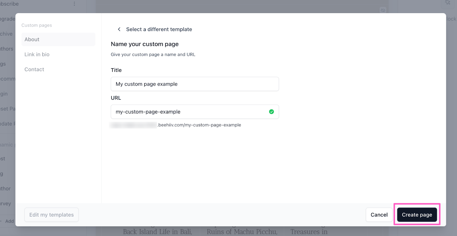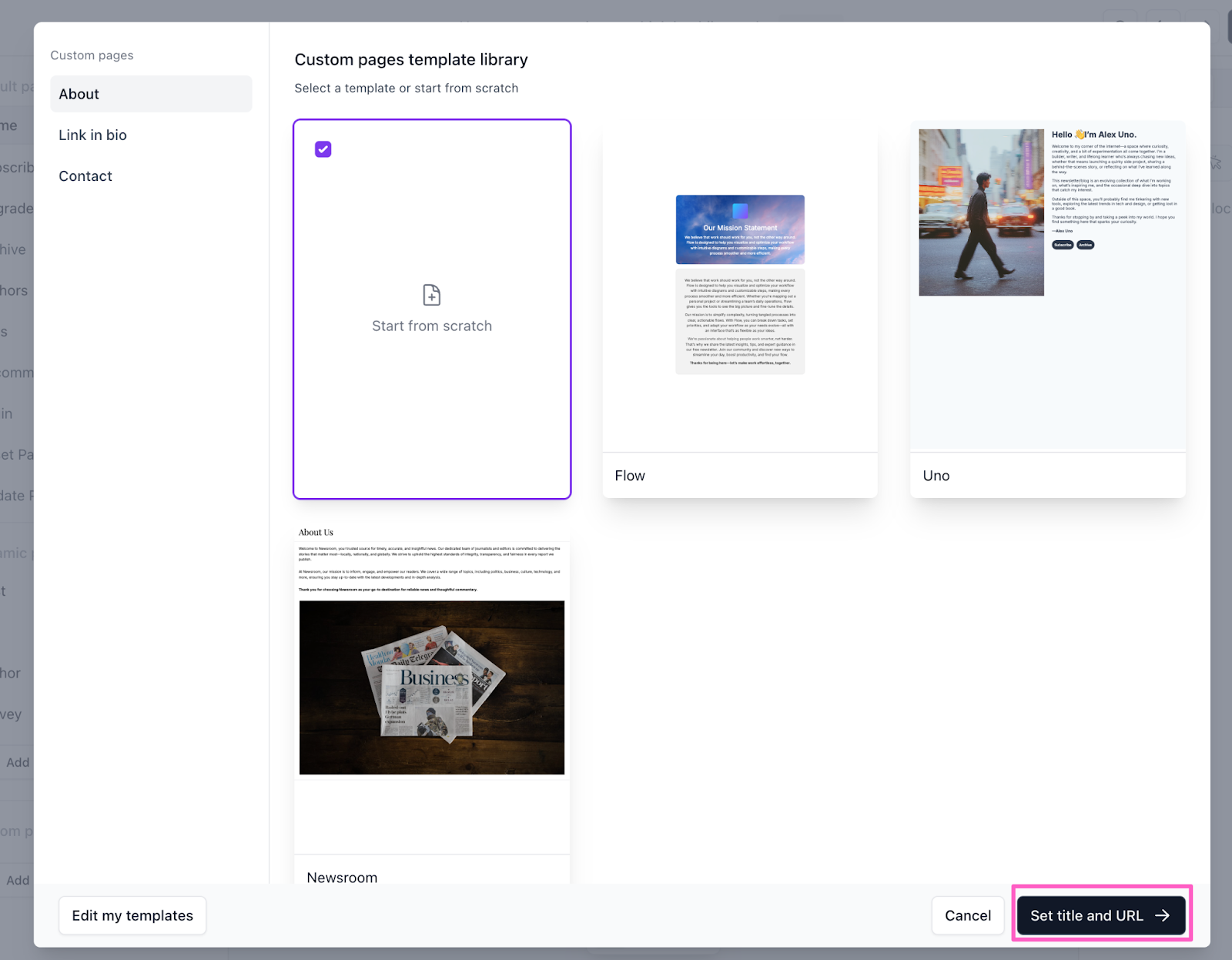 - After selecting a template, click Set title and URL. Then, enter your page details, and click Create page.