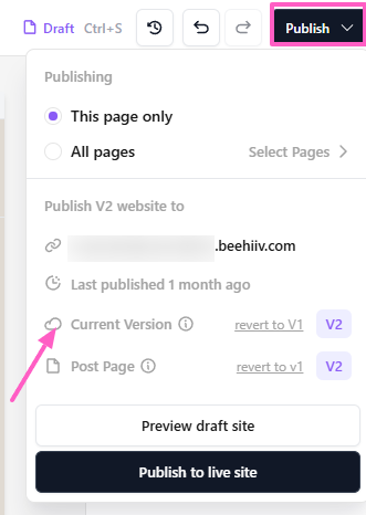 To check which version of your site is live while using the new website builder, click the Publish button in the top navbar. You’ll see which version is currently live (v1 or v2) and have options to revert if needed.