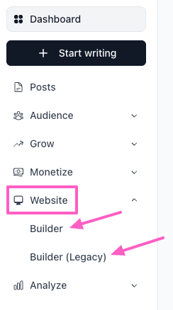 Legacy Builder: If your publication was created before July 15, 2025, you’ll see both Builder and Builder (Legacy).