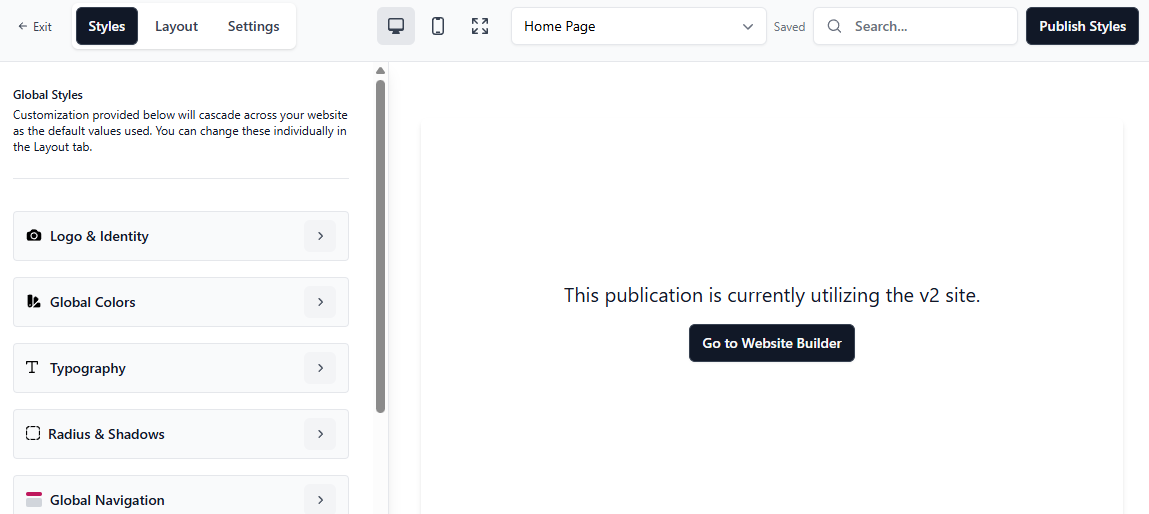 Once you publish your site in the new builder, returning to the legacy builder will display an in-app message directing you back to the new (v2) Website Builder.