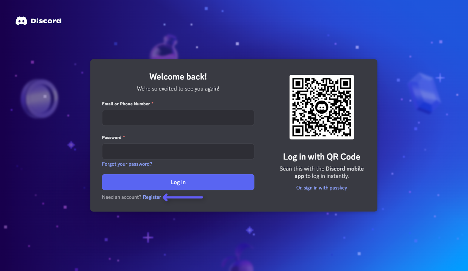 - Click the Log In button and sign in with your existing Discord credentials.