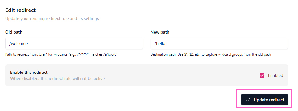 Edit a redirect’s path by clicking the pencil icon. Once finished, click on ✓ Update redirect to save changes.