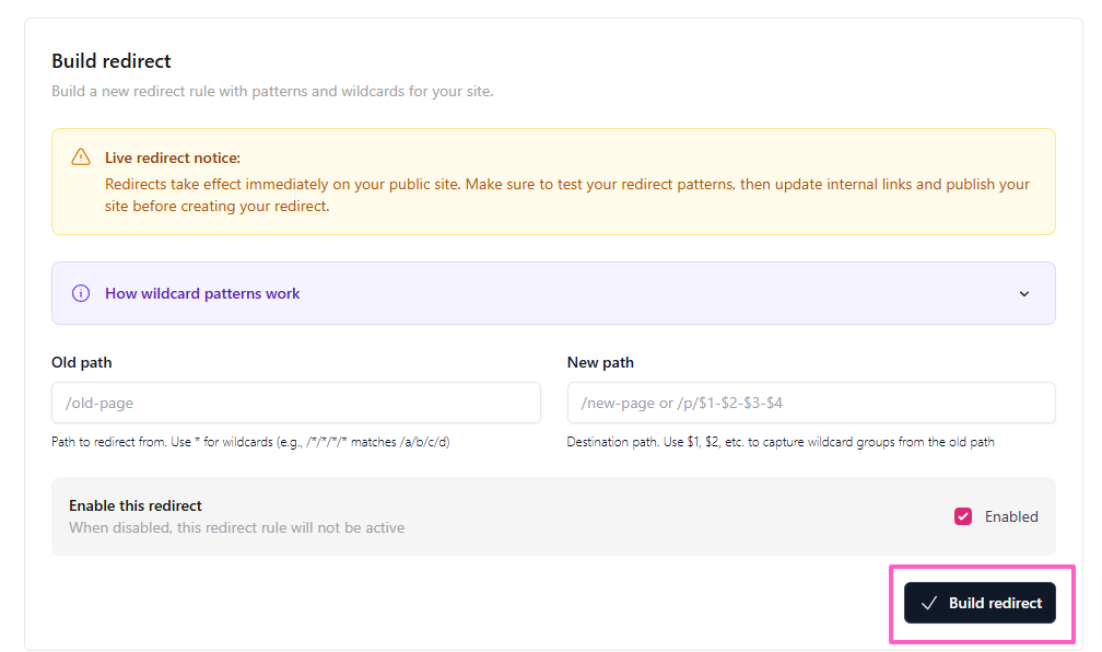 From your Redirects dashboard, you can use the Build redirect tab to create new redirects, including simple path-to-path mappings to more complex, dynamic wildcard rules.