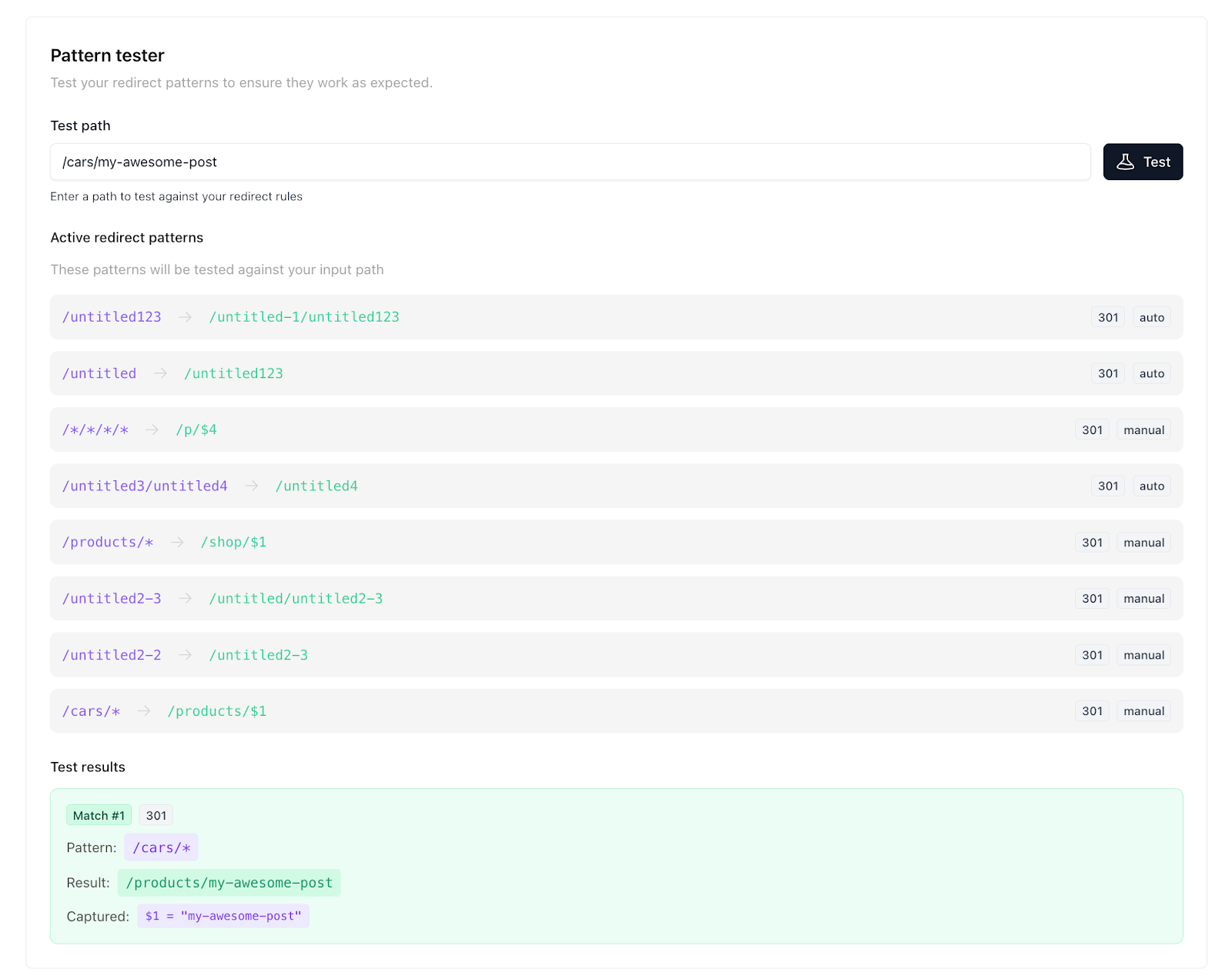 The Test patterns tab in your Redirects dashboard provides a sandbox environment to test and verify that your redirects work as expected, which is especially helpful for wildcard patterns.