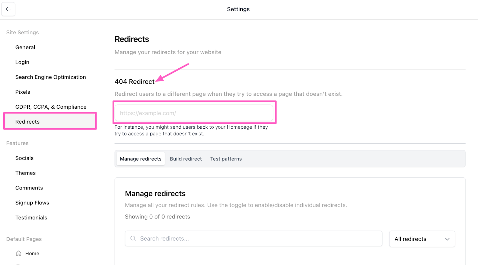 - Under 404 Redirect, enter your preferred redirect URL. Make sure that you enter the full URL, including https://.
