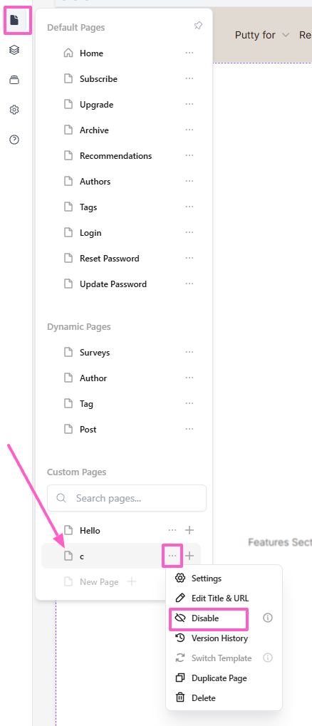 - Once you’ve created this page, it will appear under Custom Pages in the left panel. Click on the 3 dots menu next to the page title, then click Disable.