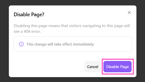 - A Disable Page? modal will appear. Click on the Disable Page button to make it inaccessible.