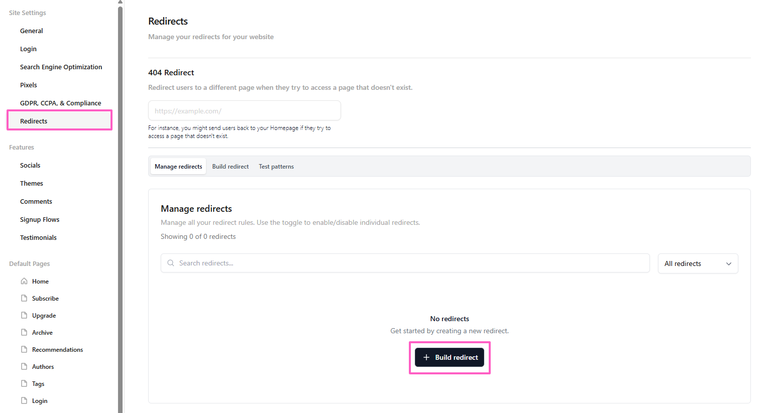 - Your Redirects dashboard will open on the Manage redirects tab. If you haven’t created any redirects before (either manual or automatic), you can do so from here. Click the + Build redirect button.