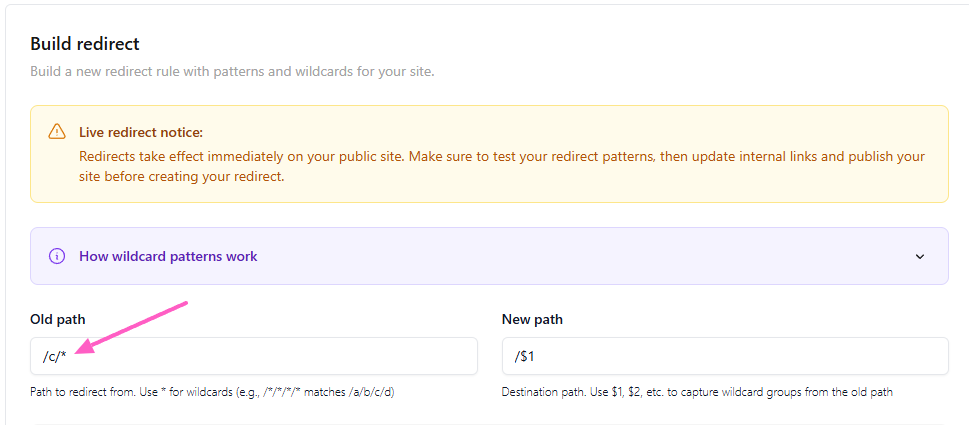 This option uses wildcard patterns to redirect old URLs to new ones without creating individual redirects for each page. Learn more in our guide on Website redirect options.