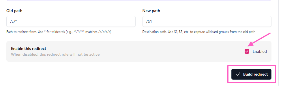 - Ensure that Enable this redirect is checked, then click on the Build redirect button.