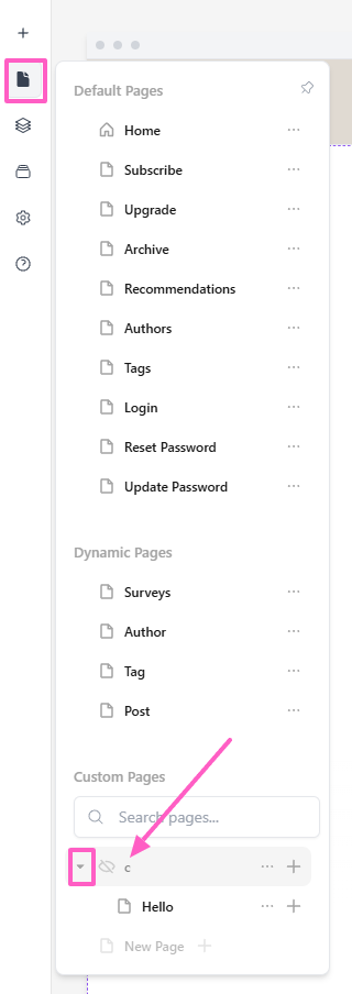 - Open the new Website Builder. From the left panel, click on the Pages icon. Under Custom Pages, select New Page to create a new page.
