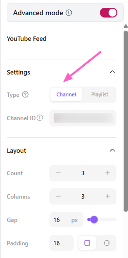 Channel: Shows the most recent videos from a YouTube channel (requires a channel ID).Playlist: Shows the most recent videos from a playlist (requires a playlist ID).