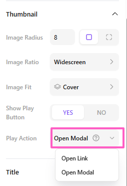 Open Link opens the video in a new tab on YouTube. Open Modal plays the video in a popup window on your site (recommended for keeping subscribers engaged).