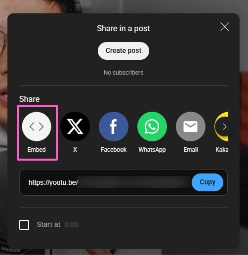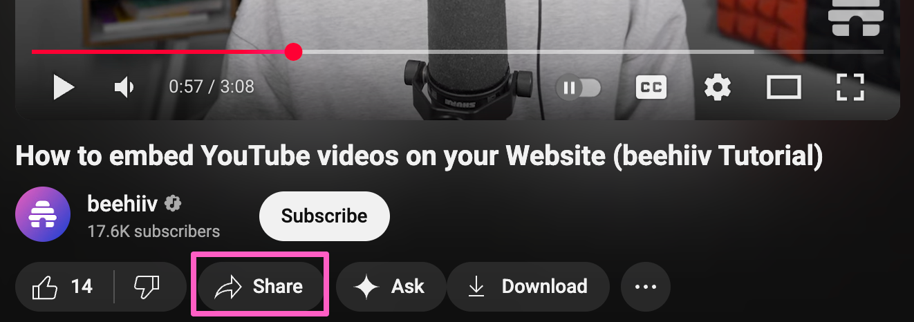 - In another browser tab, navigate to the YouTube video you wish to add to your website, then click on the Share button.