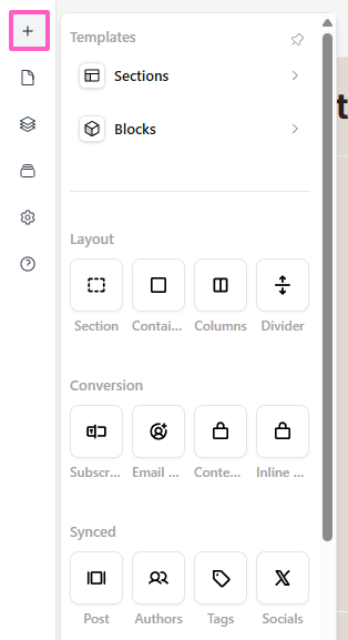 - From the icons menu on the left, click on the + icon to open the elements menu.