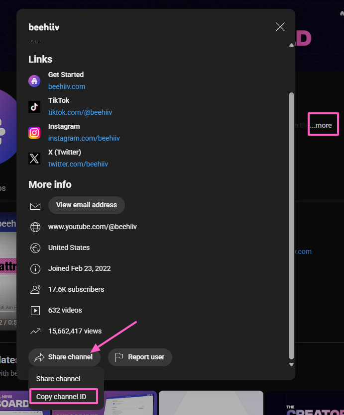 - Once copied from YouTube, go back to your beehiiv account and paste it into the Channel ID text field.