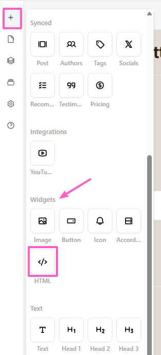 - Scroll down to the Widgets section. Click on the HTML element, and then drag it to the spot on your page where you want the video.