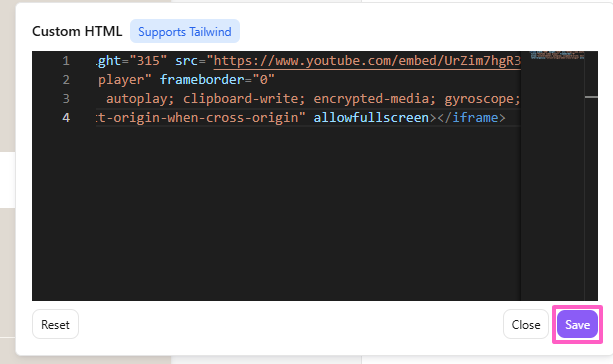 - Return to beehiiv, and paste the embed code into the custom HTML block. Click on the Save button.