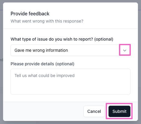 If you select the thumbs down option, a follow-up window will appear where you can choose the issue from a dropdown menu and/or enter additional details. When you’re finished, click Submit. To close the window without sending feedback, click Cancel.