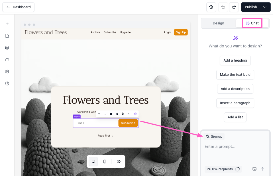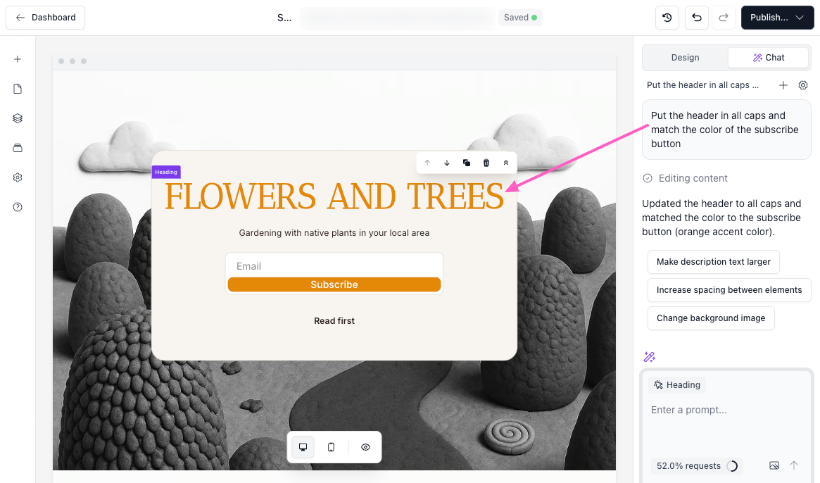 Enter a natural prompt into the prompt box. For the pictured example (below), we used: Put the header in all caps and match the color of the subscribe button.