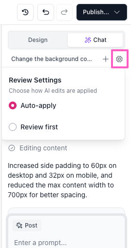 - Chat mode (default) lets you build or edit your page by engaging naturally with the AI. Your website’s theme acts as the design context for your prompts.