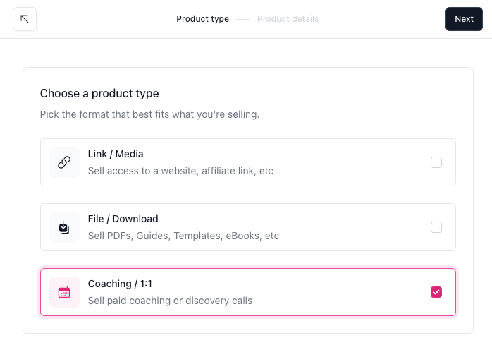 • Coaching / 1:1: (Max and Enterprise plans) Offer paid coaching, consultations, or discovery calls.