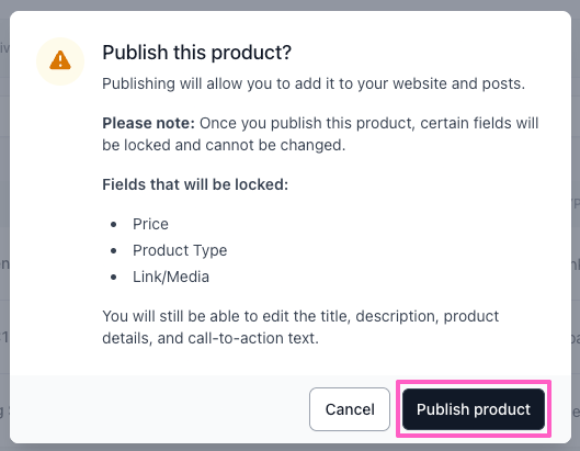 1. When publishing, you’ll be asked to confirm your choice. Once a product is published, certain fields become locked and cannot be edited (including price, product type, links, files, and connected calendars).