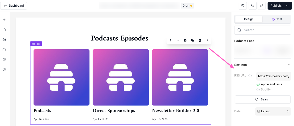 Find your podcast. The block will initially display beehiiv placeholder content. Go to the design panel on the right to replace it with another live podcast feed.