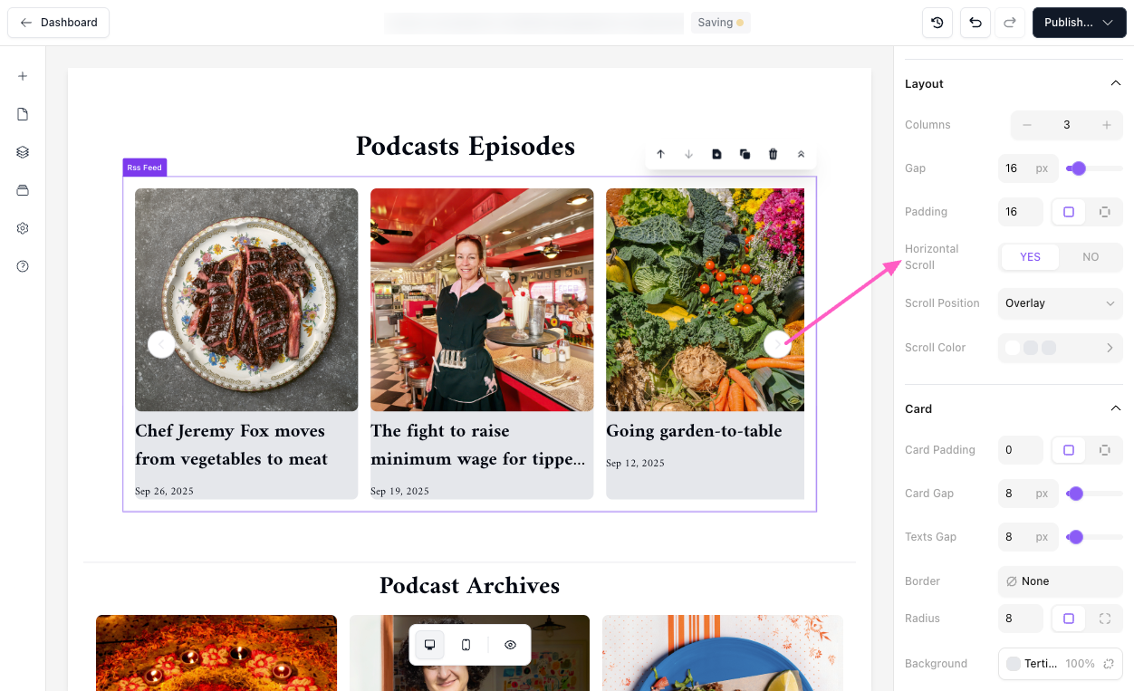 Customize the design. In the design panel, adjust the Layout, Card, Thumbnail, Title, and Date options to match your brand. You can enable horizontal scrolling, change thumbnail styles, or modify text and background colors for your feed cards.
