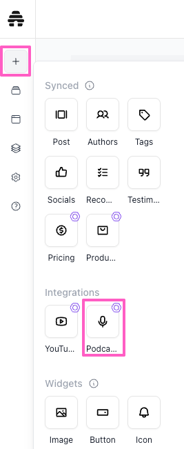 Add the Podcast block. From the left-hand toolbar, click the + icon to open the elements menu, then scroll down to Integrations.