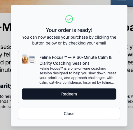 Third-party calendar links (e.g., Calendly): Immediately upon purchase, buyers receive a modal with a link to schedule/redeem their session.