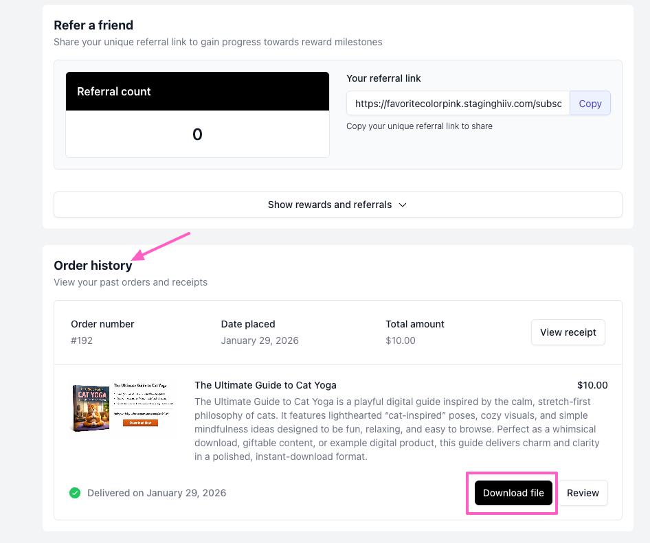 After clicking the link in their purchase email, they can scroll to Order history to view details.