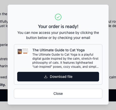 Instant access modal: Upon purchase, buyers will be provided with a modal where they can access their digital product immediately.