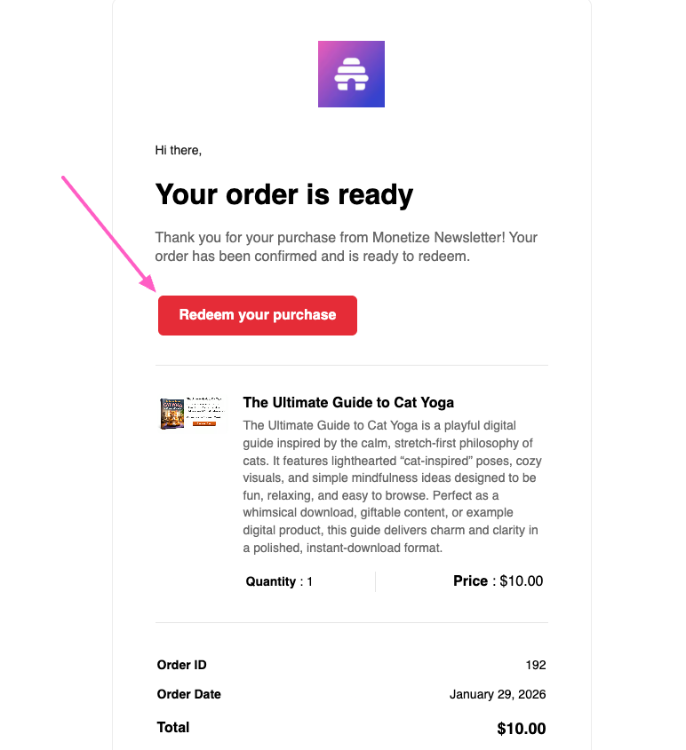 Email with link: Buyers are also sent an email with a link to their subscriber center, where they can access their purchases at any time by clicking on Redeem your purchase.