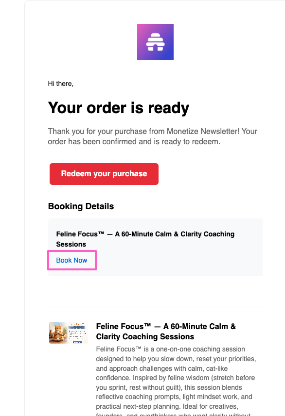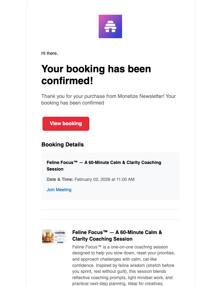 Cal.com integration: If you are using the cal.com native integration, buyers schedule during checkout and receive a confirmation email with a link to manage their booking.