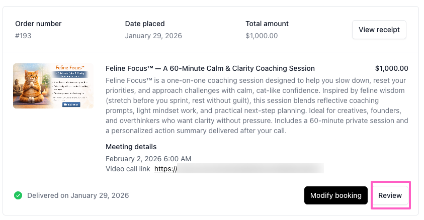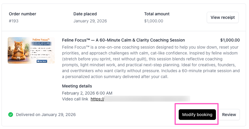 Buyers who purchased a coaching session will see their appointment details, including their video call link (when applicable), and have the option to modify their booking, if needed.