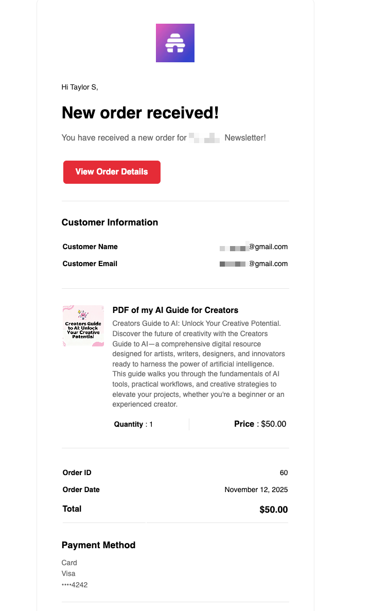 When someone purchases a digital product from your site, the workspace owner automatically receives an order confirmation email with a link to view the order details.