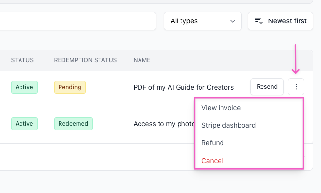 If a buyer reaches out because they can’t find their purchase email, click Resend next to the order to send it to them again.