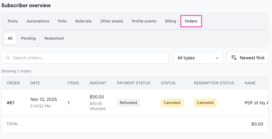 - From your Orders page in beehiiv, open the 3 dots menu for the order and select Cancel.