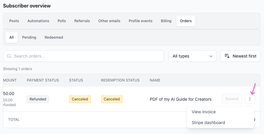 - From your Orders page in beehiiv, open the 3 dots menu for the order and select Stripe dashboard.