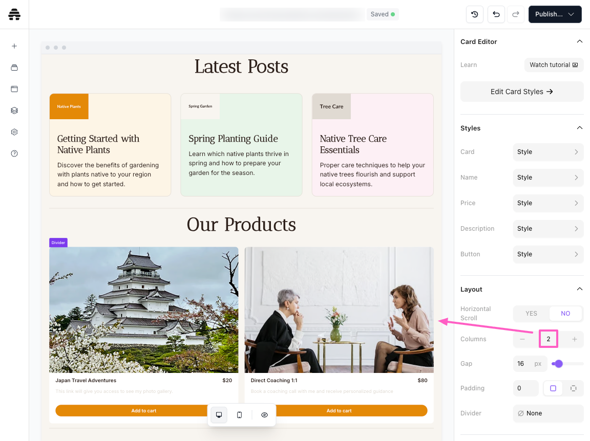 - Your selected product(s) will appear on the canvas. Use the design panel on the right to customize the look of the product cards. In the screenshot below, under the Layout section, we adjusted the Columns to 2 from 3.