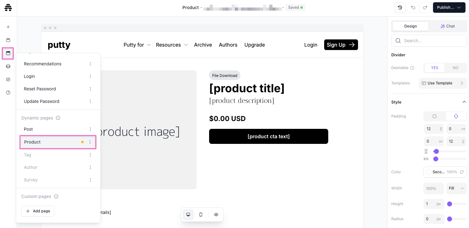 - From the left toolbar, click the + icon to add an element. Under Dynamic pages, select Product.