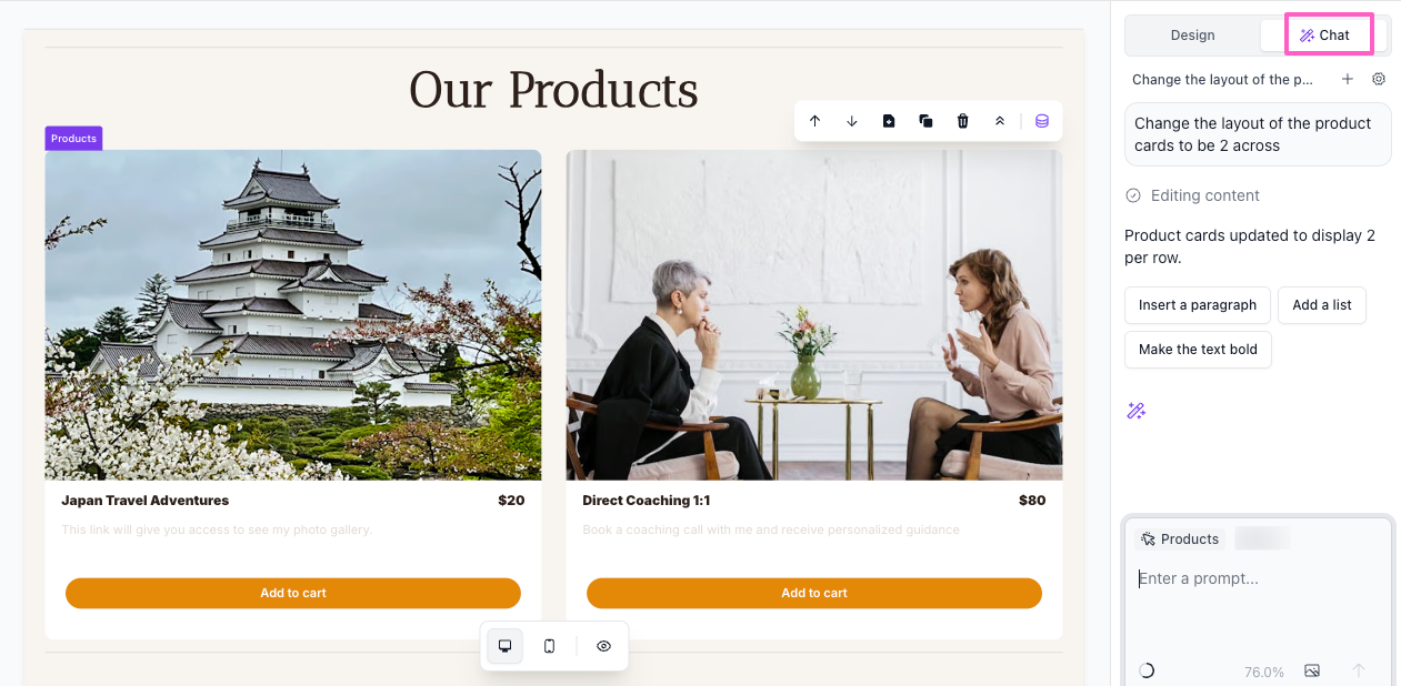 - Switch to Chat mode to use AI prompts for faster styling updates.