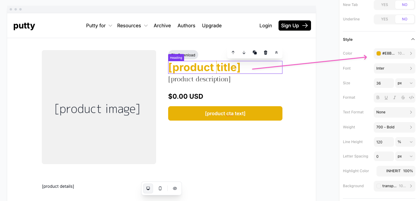 - The product page template will load on the canvas. Click any element on the page to open its settings in the design panel on the right.