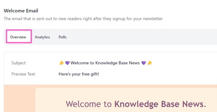 The Overview tab displays key details about your welcome email, including the subject line, preview text, and email content.
