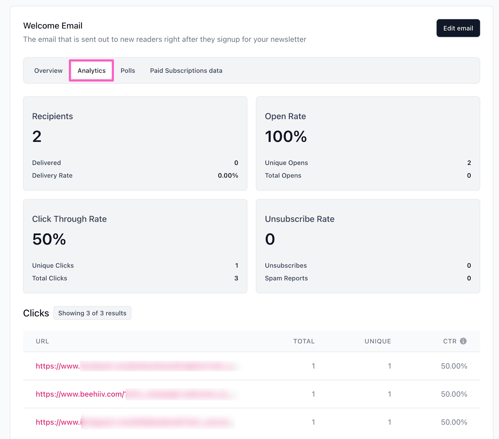 The Analytics tab provides detailed metrics on your welcome email's performance, offering valuable insights including: