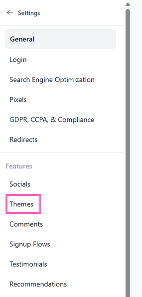 - Your site settings will open on the General page. From the left panel, click Themes.