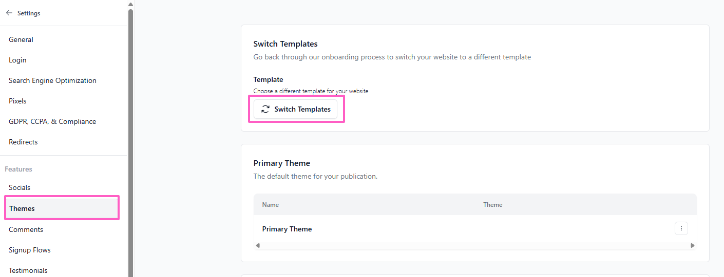 - Your site settings will open on the General page. From the left panel, go to Themes, then click Switch Templates on the right.