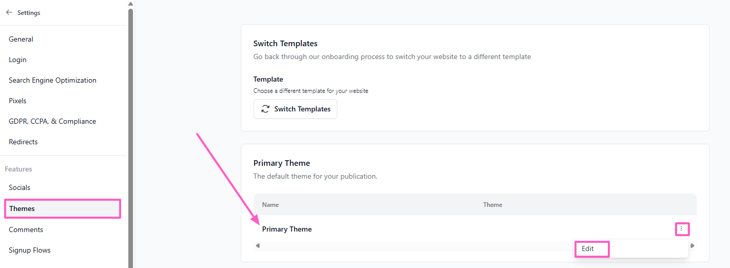 - On the Themes page, go to the Primary Theme section. Click the 3 dots menu next to the theme and select Edit.