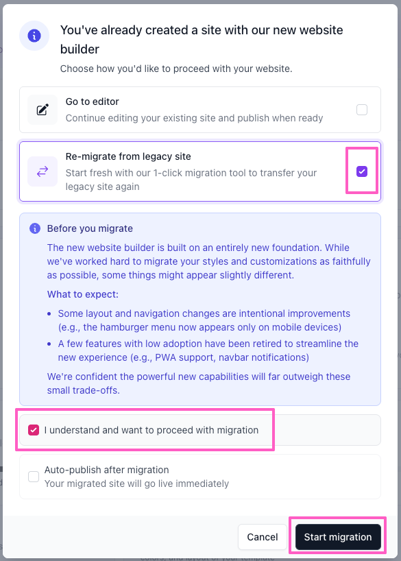 • (Optional) Select Auto-publish after migration if you’re ready to make your site live immediately.